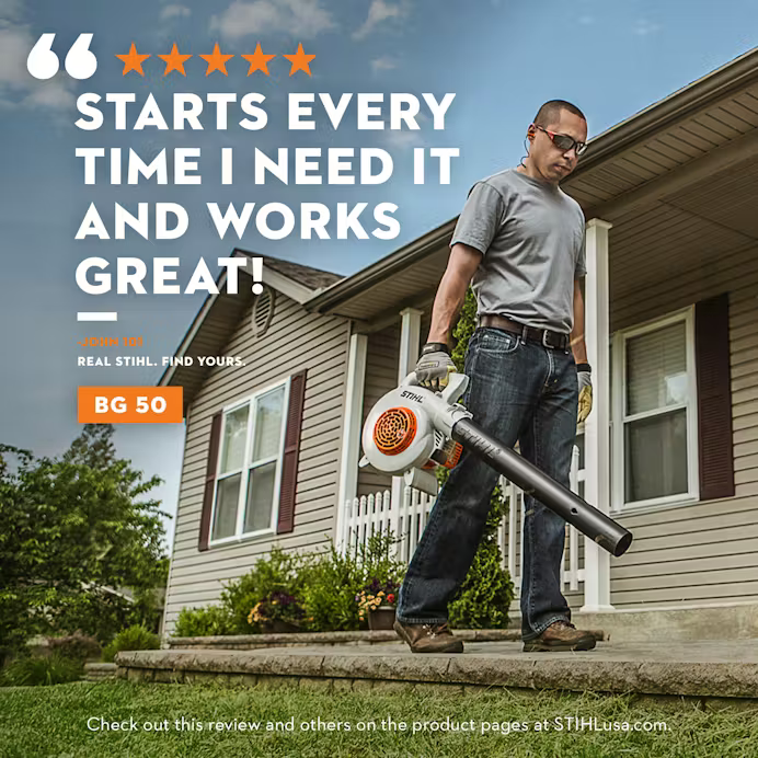 Get superior performance from STIHL’s BG 50 gas-powered handheld leaf blower. Made here in America from U.S. and global materials, the reasonably priced BG 50 Handheld Leaf Blower boasts the highest power-to-weight ratio in the STIHL gas-powered line, making it the perfect choice if you are a homeowner seeking premium STIHL quality. Its lightweight, compact design features a fuel-efficient engine, toolless air filter access, and an upright fuel tank for easier filling. Clean up yard waste and leaf piles quickly and easily with this affordable and convenient blower.