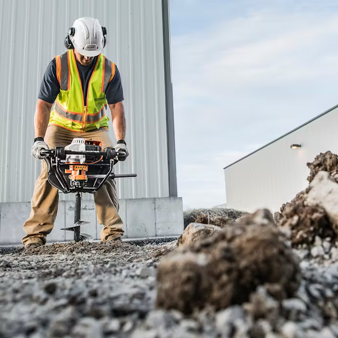 Professional gas-powered earth auger with easy starting procedure and STIHL auger brake.