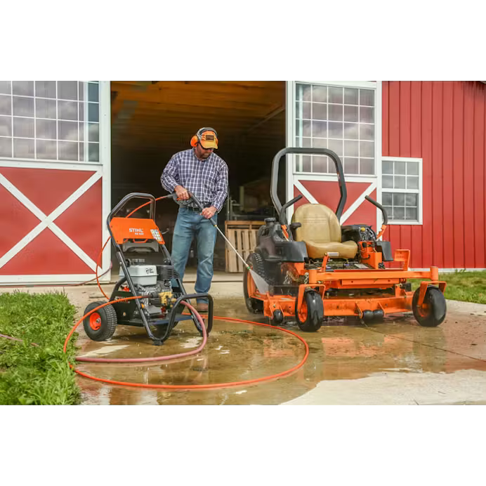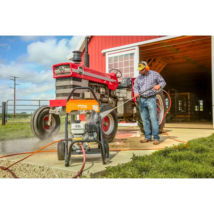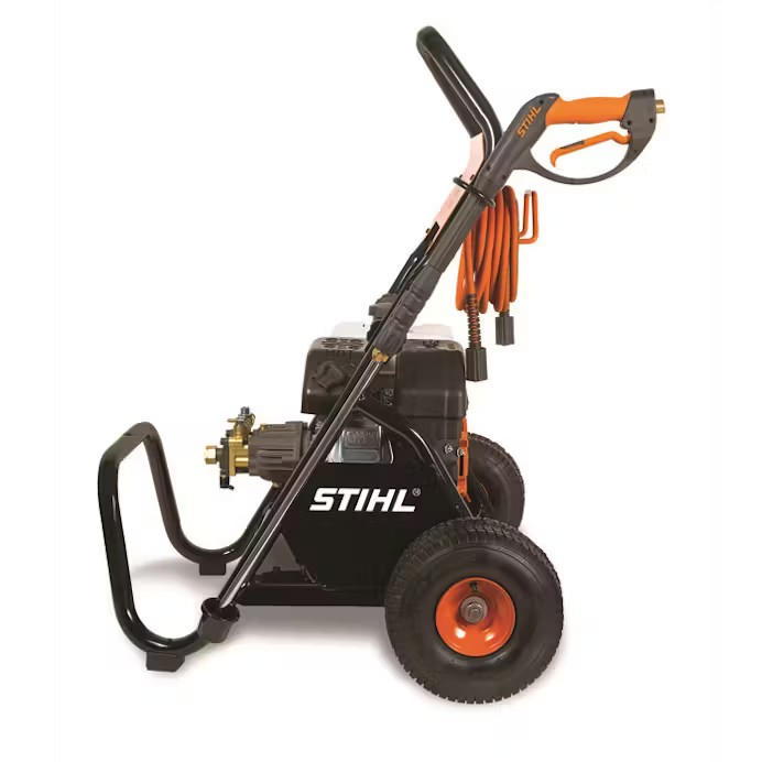 When you need a power washer that delivers top performance and can stand up to daily use, choose the STIHL RB 400 DIRT BOSS® pressure washer. It features a powerful 196 cc (6.5 hp) engine that can output 2,700 psi of water pressure at 2.7 gallons per minute. It also features the durability STIHL products are known for, with a brass manifold pump design, stainless steel valves, and ceramic-coated pistons. There is also a cast-iron engine liner and a built-in shutdown feature when the oil level is low. The RB 400 DIRT BOSS® also features an easy start pump system and convenient detergent injector system. With its 25' no-kink flex hose, you can clean more area without having to move the machine. Finally, the pressure washer uses a wide range of optional cleaning accessories, including rotary surface cleaner, water broom, nozzle options, hose extensions, a gutter cleaner, aluminum wand extension, pivot coupler, and official STIHL cleaning agents. When you need to demolish dirt on a daily basis, the DIRT BOSS® handles the pressure with ease.