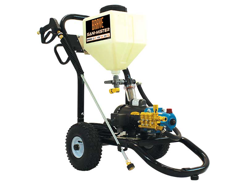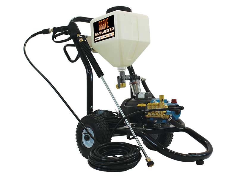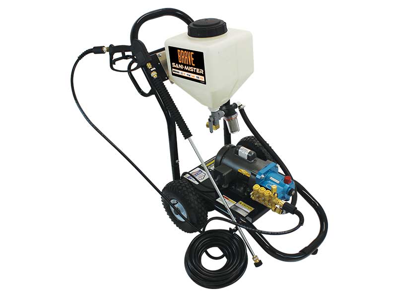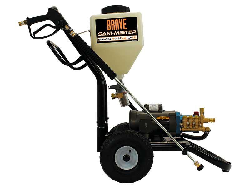 The Brave Sani-Mister (BRM500) sanitizes and disinfects against bacteria, viruses, fungus, and spores. This industrial sanitizer sprayer provides complete coverage for floors, walls, tables, and equipment for your business. The Sani-Mister also features an easy to measure tank, flushing valve for cleanup, heavy-duty tubular frame, and pneumatic wheels.