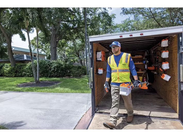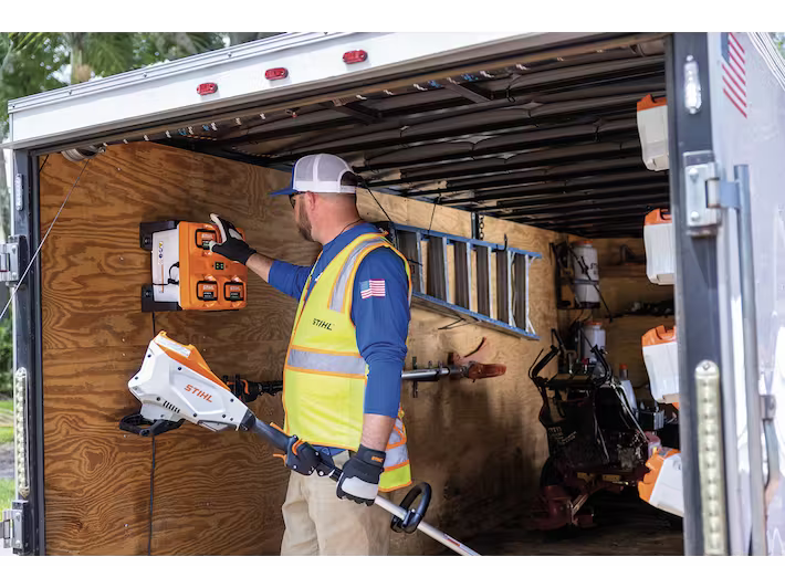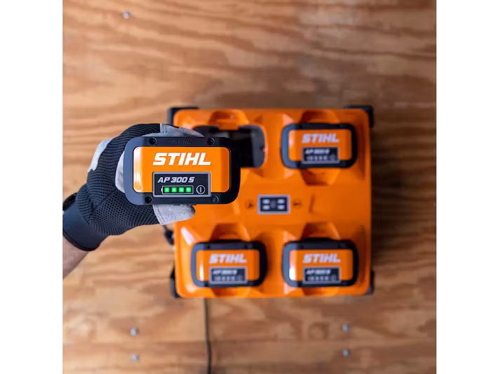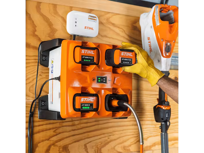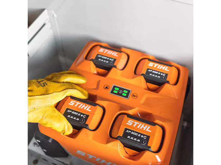 A powerful new accessory for STIHL battery-powered fleets, the AL 301-4 Multi-Charger can sequentially charge up to four AP or AR batteries. Ideal for charging batteries overnight in a workshop or on the go, this charger helps keep professionals powered up and moving all day long—it can charge up to four AP 300 S batteries in just under five hours. Approved for mobile use, the AL 301-4 can simplify charging logistics between jobs. LED indicator lights help show when batteries are fully charged and ready to go, or if they are too hot or cold for use. With its sequential charging, the AL 301-4 uses a reduced amount of energy that enables plugging in up to three chargers on a single 15A/120V circuit. Pros can also save space in their workshop or by mounting the charger to a wall or shelf, or by stacking units up to three high. With its flexibility and convenient charge times, the AL 301-4 Multi-Charger will be a powerful addition to any STIHL battery-powered fleet of tools.