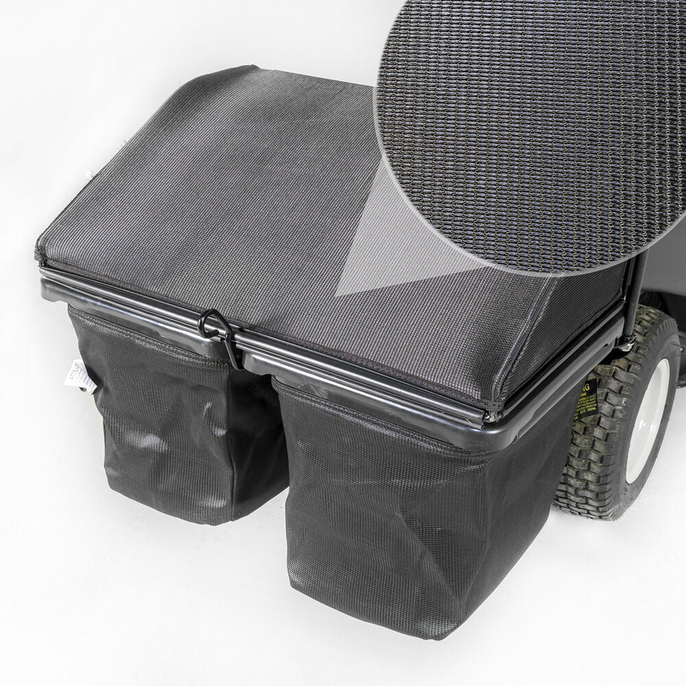This double bag grass collection system mounts quickly and easily to your riding mower. The vented Nylon bags provide superior strength and airflow to reduce grass from clogging.