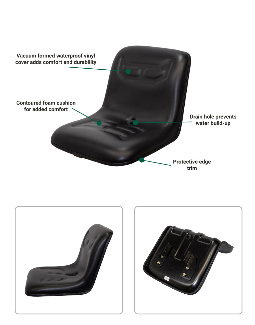 - Vacuum-formed and contoured foam cushions to provide maximum comfort and durability