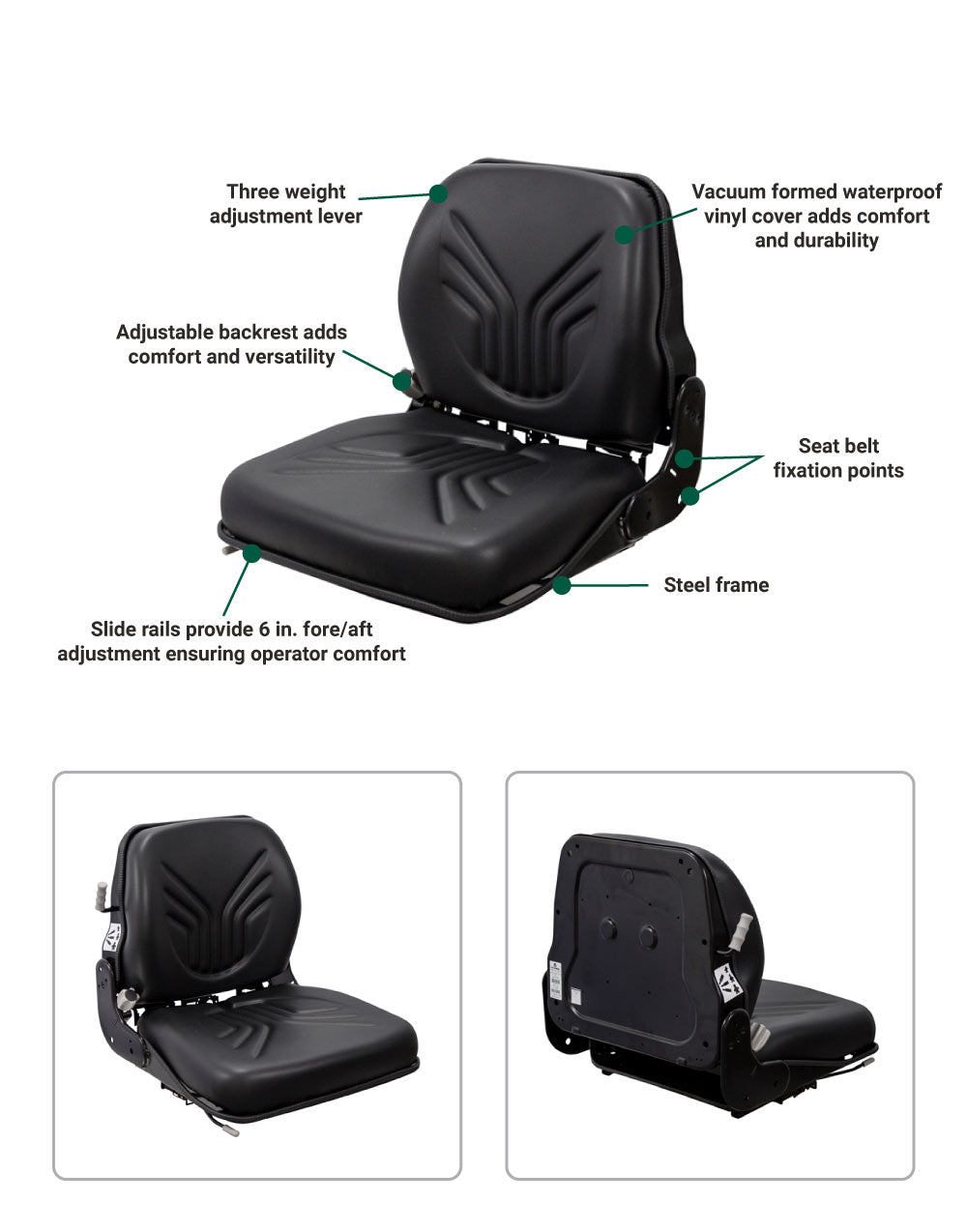 • Forklift seat with seatbelt fixation points for added safety