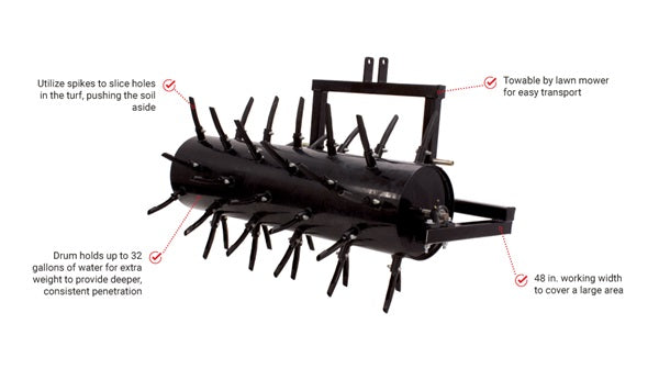The Maxim plug aerator 48-in. tow-behind model is the ideal solution for clay soils and larger lawns. Easily attach it to your riding lawn mower or tractor using the versatile 3-point hitch for seamless operation. The bolt-in, replaceable spoons remove plugs of soil, allowing oxygen, water, and nutrients to penetrate deep into the turf. This process reduces soil compaction and encourages healthy root growth. The tow bar design lets you quickly rotate the drum for aeration or transport, while the durable 410/350-4, 2-ply tires ensure smooth movement during transport. Add up to 32 gallons of water for an additional 267 pounds of weight to penetrate the thickest soils.