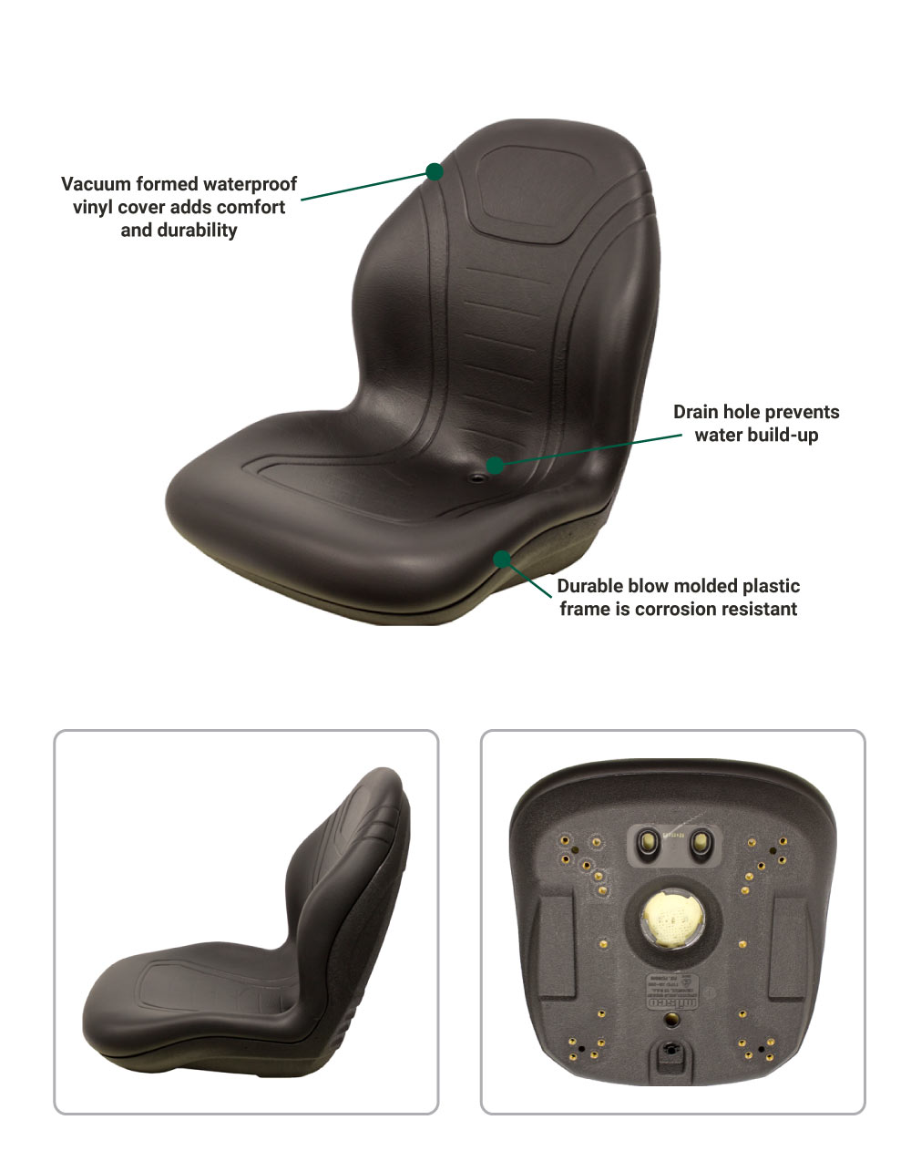 - Durable blow molded plastic frame is corrosion resistant