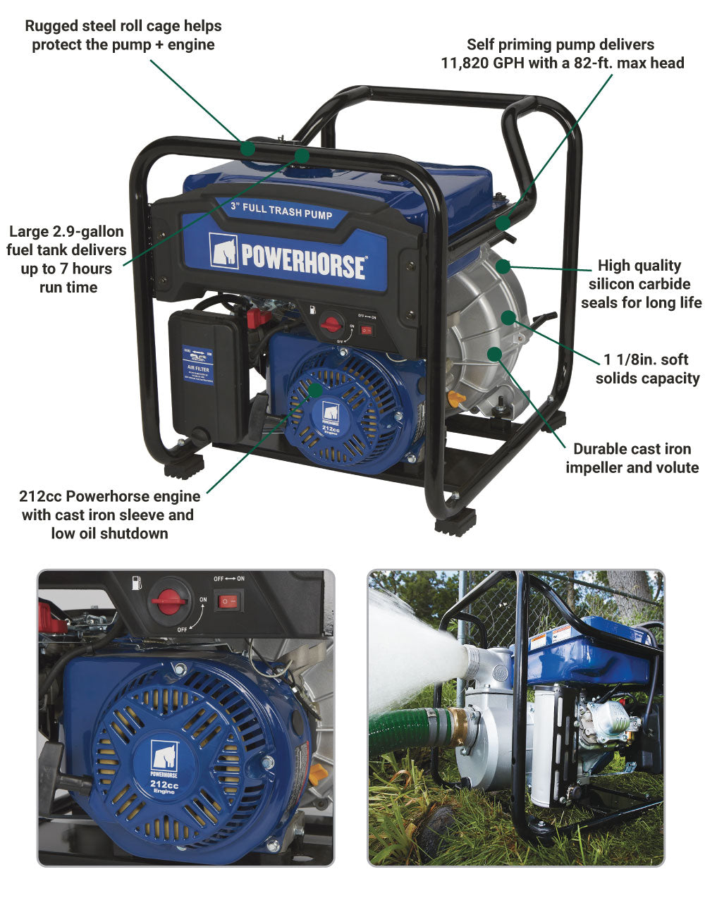Powerhorse 3-inch extended-run full trash pump is ideal for big jobs needing superior performance and durability. It is ruggedly built with a protective steel roll cage, high-quality silicon carbide seal, and a rugged cast iron impeller and volute. It also features an aluminum pump housing for corrosion resistance.
