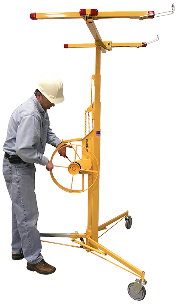 The original drywall lift from Telpro, Inc. is heavy-duty, easy to assemble and disassemble, portable, and allows one person to lift and install drywall panels with ease.
