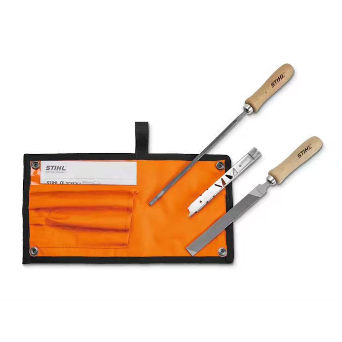 The HEXA™ Complete Filing Kit is specially designed to make sharpening the RAPID™ HEXA™ chain simple for all users. The HEXA™ chain allows for fast and easy filing by hand and is designed to cut up to 10% faster when compared with the STIHL RAPID™ Super saw chain. The STIHL RAPID™ HEXA™ saw chain requires a special patented hexagon-shaped file to maintain the high-performance HEXA™ cutter shape when hand filing. The HEXA™ Complete Filing Kit includes the patented 6-sided, hexagon-shaped file, a flat file for maintaining the saw chain depth gauges, depth gauge, and two STIHL wooden file handles in a convenient roll-up tool pouch for easy storage and transportation.