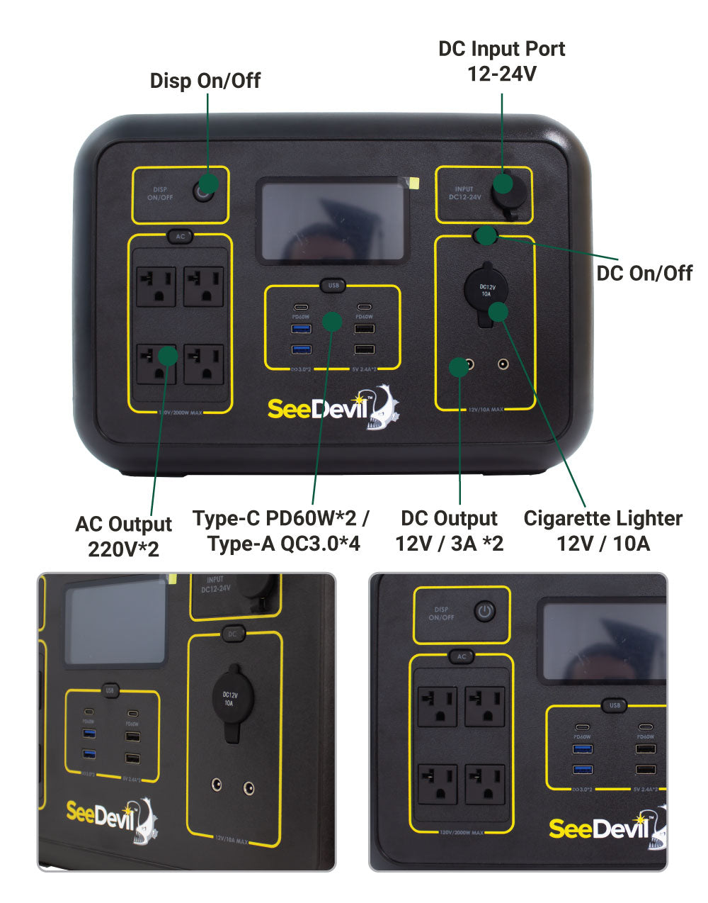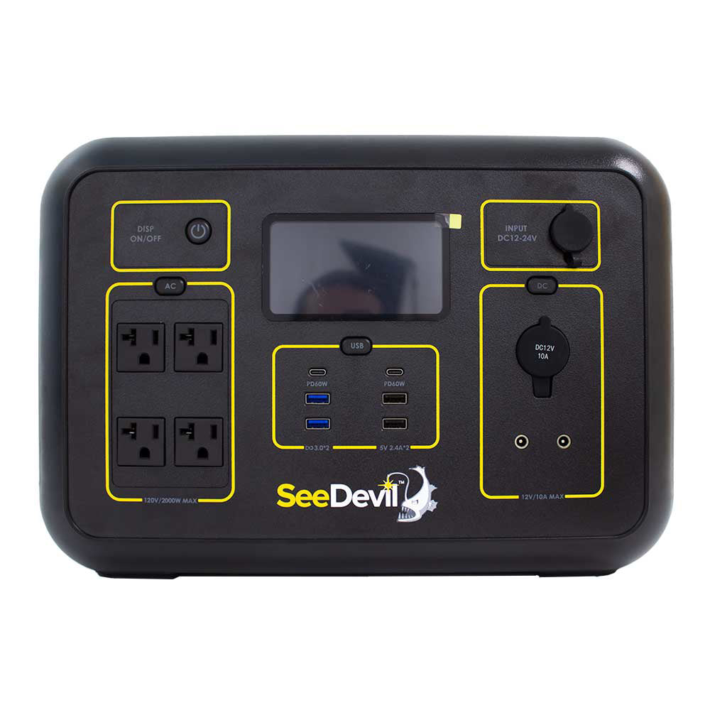 - CONVENIENCE - The SeeDevil 2000 is weighing in at only 37lbs and providing you with a total of 13 output ports including, (2x) 110V/500W AC output ports(pure sine wave), (2x) DC ports(9V-12.6V/3A max output), (2x) 5V/2.4A USB ports, (2x) type-c PD 60W quick charge port, (1x) regulated 12V/10A cigarette lighter port, to power all your devices. Take power to any outdoor environment, go camping or travel & stay powered.